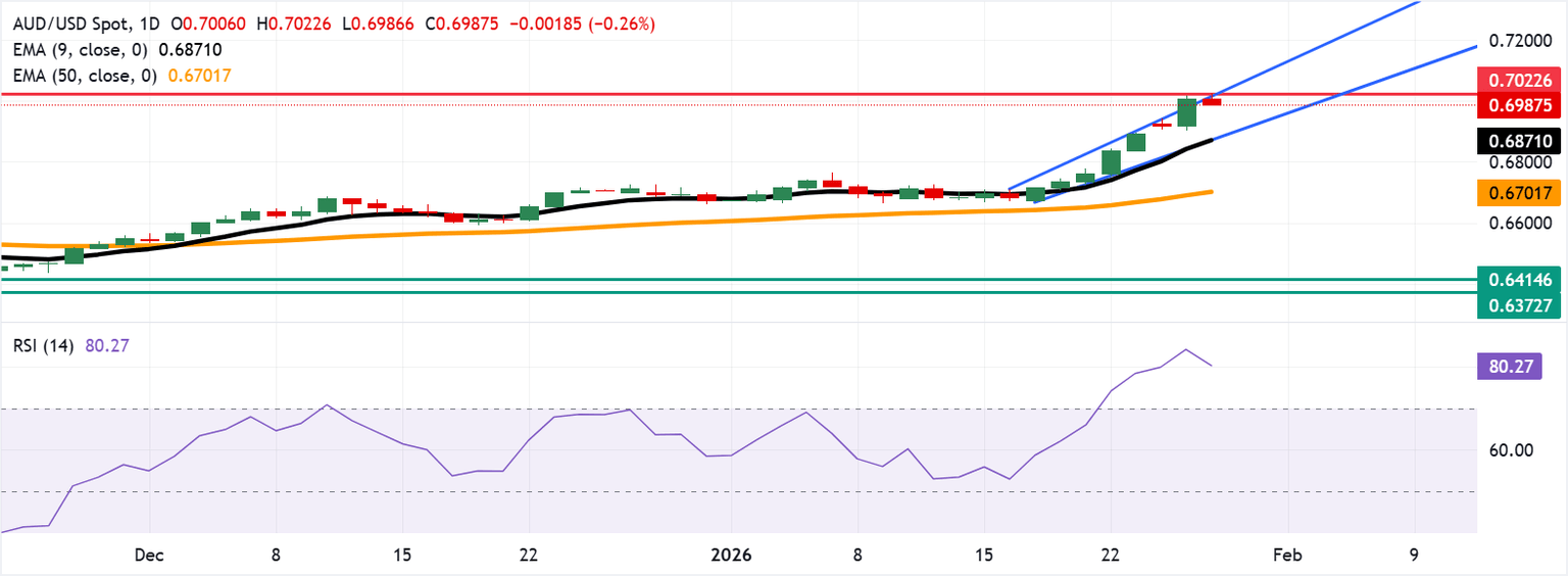 The AUD/USD pair tested the confluence resistance zone around the upper boundary of the ascending channel near the 0.7022, the highest level since February 2023, recorded on Wednesday. On the downside, the primary support lies at the nine-day Exponential Moving Average (EMA) at 0.6871, aligned with the lower ascending channel boundary. A break below the channel would weaken the bullish bias and target the 50-day EMA of 0.6701.