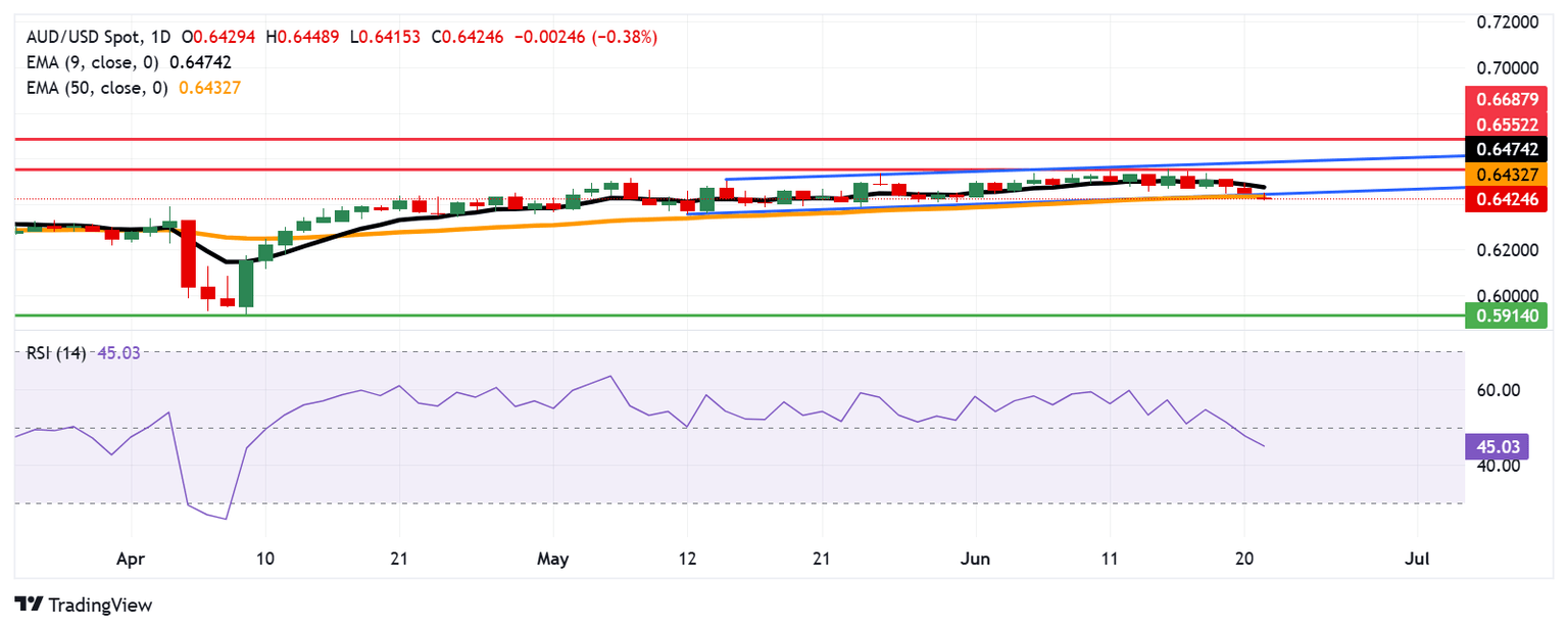 The primary barrier appears at the 50-day EMA of 0.6432, followed by the lower boundary of the ascending channel around 0.6450. A successful rebound to the channel would revive the bullish bias and support the pair to test the nine-day EMA at 0.6474. A break above this level would reinforce the bullish sentiment and lead the AUD/USD pair to approach the seven-month high of 0.6552, which was recorded on June 16.