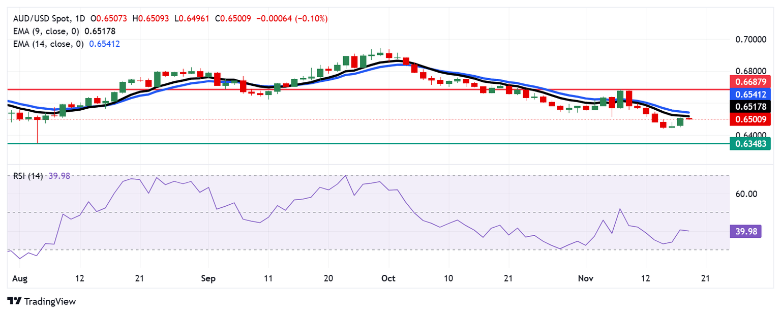 The AUD/USD pair hovers near 0.6500 on Tuesday, signaling short-term bearish momentum on the daily chart as it remains below the nine-day Exponential Moving Average (EMA). Additionally, the 14-day Relative Strength Index (RSI) sits below the 50 mark, reaffirming the bearish trend.