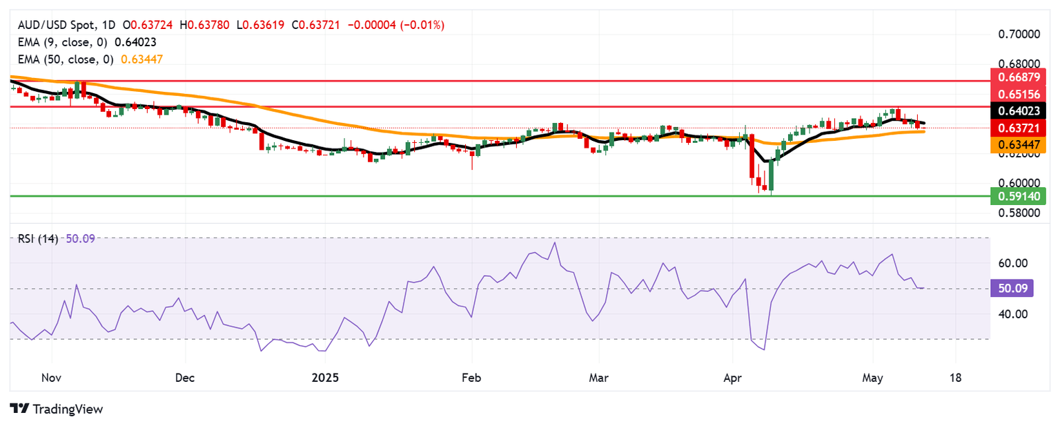 The AUD/USD pair rises to near 0.6400 on Tuesday. Technical analysis of the daily chart indicates a bearish outlook, with the pair trading below the nine-day Exponential Moving Average (EMA). Furthermore, the 14-day Relative Strength Index (RSI) has dipped below the 50 mark, reinforcing the bearish sentiment.