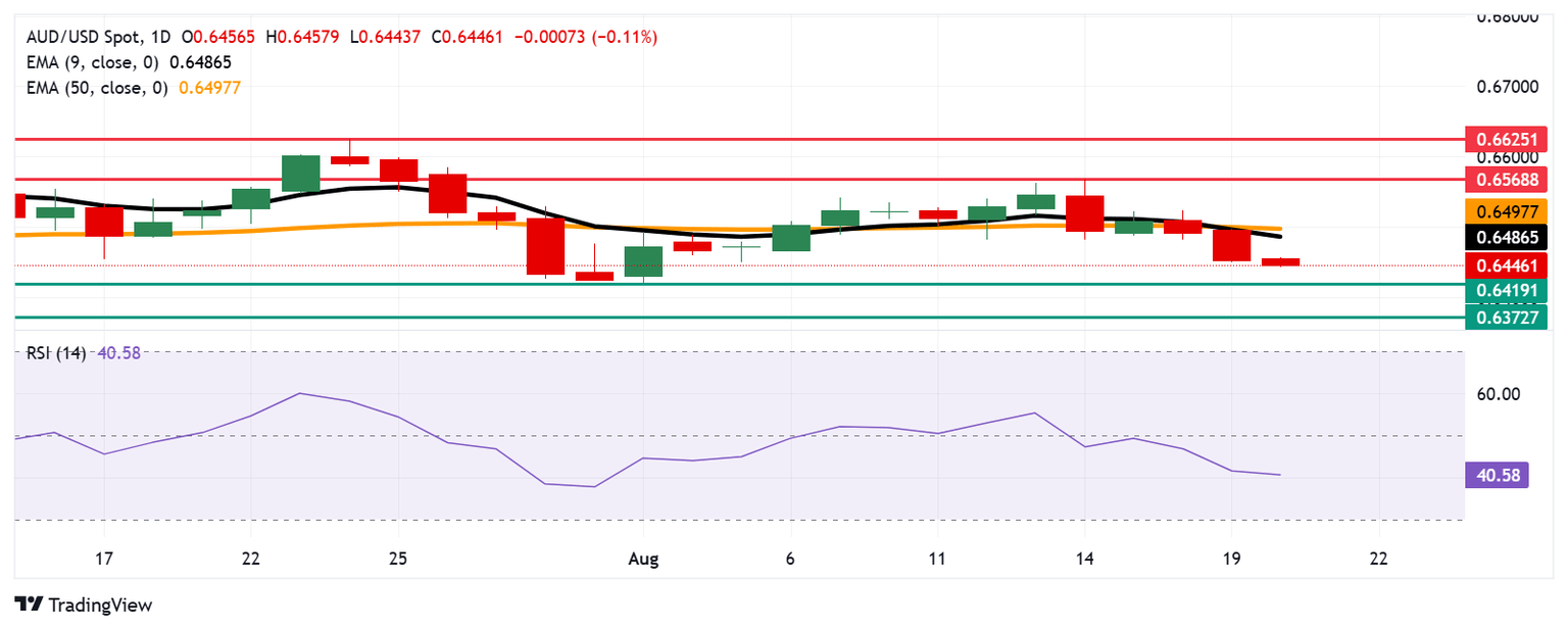 AUD/USD is trading around 0.6450 on Wednesday. The technical analysis on the daily chart indicates that short-term price momentum is weakening as the pair remains below the nine-day Exponential Moving Average (EMA). Additionally, the 14-day Relative Strength Index (RSI) is positioned below the 50 level, suggesting that market bias is bearish.
