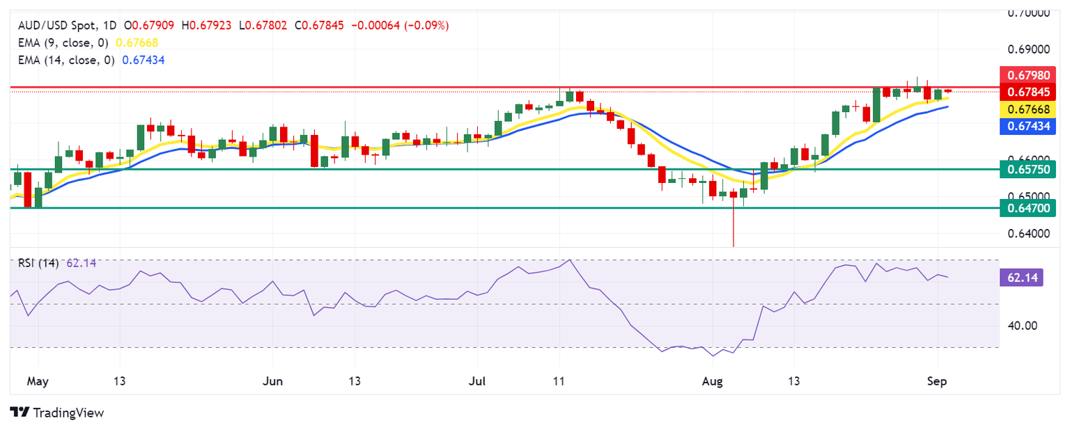 The Australian Dollar trades around 0.6780 on Tuesday. Analyzing the daily chart, the AUD/USD pair is positioned above the nine-day Exponential Moving Average (EMA), suggesting a short-term bullish trend. Additionally, the 14-day Relative Strength Index (RSI) remains above the 50 level, reinforcing the overall bullish trend.