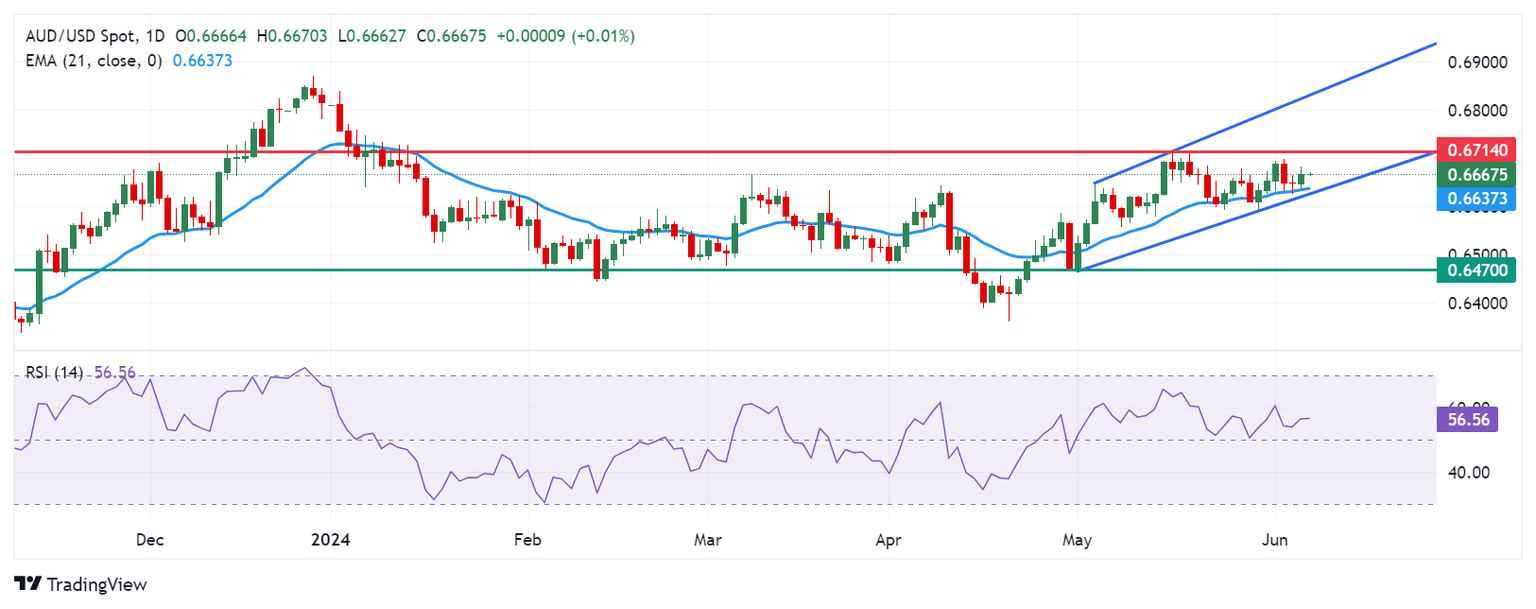 The Australian Dollar trades around 0.6660 on Friday. Analysis of the daily chart indicates a bullish bias for the AUD/USD pair as it consolidates within an ascending channel pattern. This bullish bias is further confirmed by the 14-day Relative Strength Index (RSI), which is above the 50 level.