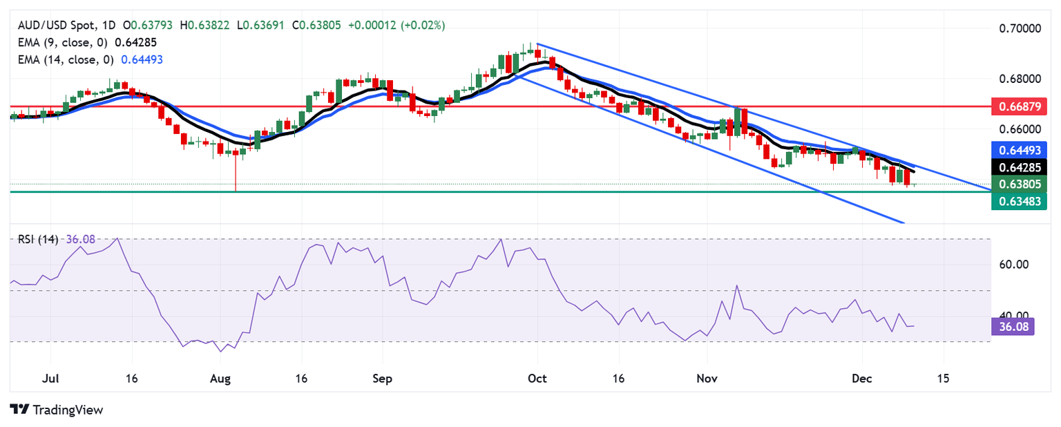 AUD/USD trades near 0.6370 on Wednesday. The technical analysis of a daily chart shows strengthening bearish momentum as the pair moves downwards within a descending channel pattern. Additionally, the 14-day Relative Strength Index (RSI) is positioned slightly above 30, indicating sustained negative sentiment.