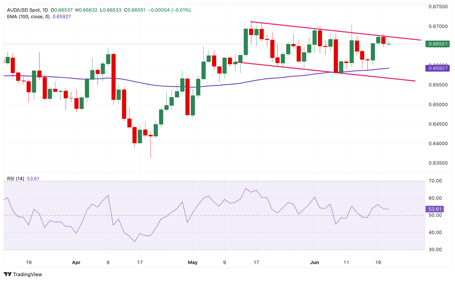 The Australian Dollar trades on a stronger note on the day. The AUD/USD pair has remained stuck within a descending trend channel since May 14. The pair maintains a positive outlook beyond the 100-day Exponential Moving Average (EMA) on the daily chart. The 14-day Relative Strength Index (RSI) continues to show bullish momentum, suggesting resistance is more likely to hold than to break.