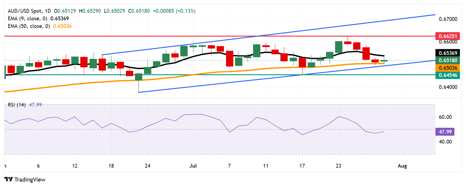 AUD/USD is trading around 0.6520 on Wednesday. The daily chart’s technical analysis indicates a bullish bias is active as the pair remains within the ascending channel pattern. However, the 14-day Relative Strength Index (RSI) is positioned below the 50 mark, indicating a bullish outlook. Additionally, the pair remains below the nine-day Exponential Moving Average (EMA), indicating that short-term price momentum is weaker.