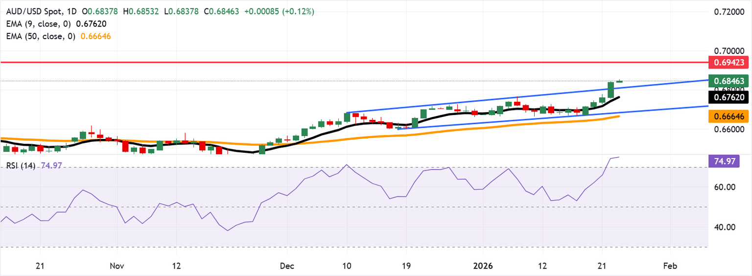 The AUD/USD pair is trading around 0.6850 on Friday. Daily chart analysis indicates that the pair is rising above the ascending channel pattern, indicating a persistent bullish bias. Moreover, the nine-day Exponential Moving Average (EMA) rises above the 50-day EMA, with the spot price holding above both and reinforcing a bullish tone. This alignment keeps upside pressure in place. The 14-day Relative Strength Index (RSI) at 74.96 is overbought, signaling stretched momentum.