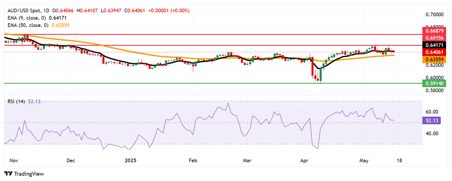 AUD/USD is hovering around 0.6410 on Friday. Technical analysis on the daily chart indicates a bearish bias, as the pair is trading below the nine-day Exponential Moving Average (EMA). However, the 14-day Relative Strength Index (RSI) remains above the 50 level, signaling that some bullish momentum persists despite the downside pressure.