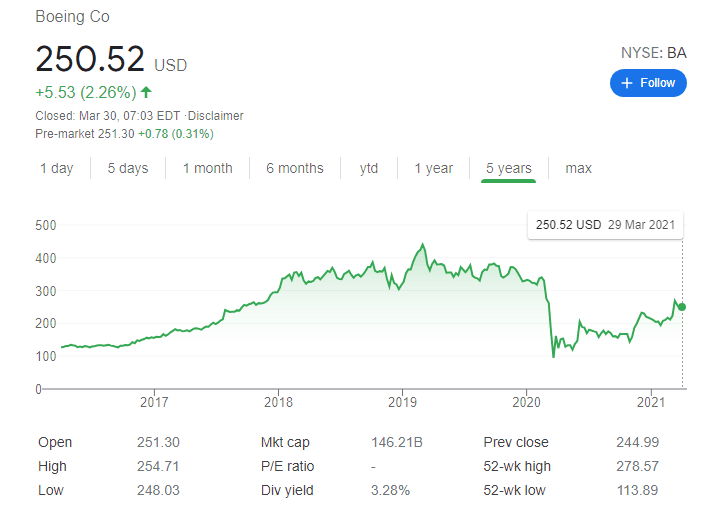 However, if shares indeed rise, that would serve as a payout or dividend to existing shareholders. NYSE: BA closed Monday's session at $25.52, up some 2.26% after the 737 and 787 news, but still below the 52-week high of $278.57. Shares hit a peak above $400 before that second fatal crash in 2019 and there is still a long way to go, despite doubling from the 52-week trough of $113.89.