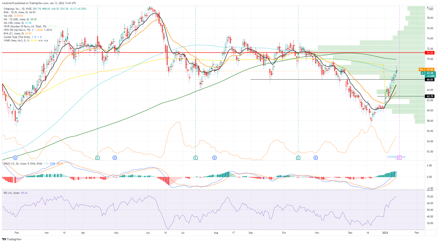 Citigroup (C) is expected to post earnings per share of $1.71 on revenue of just under $17 billion for Q4 2021. Citi has beaten earnings estimates on the top and bottom lines repeatedly. In fact, the last miss on revenue was a small 1% miss in Q4 last year and then it is back to 2019 before revenue missed estimates again.