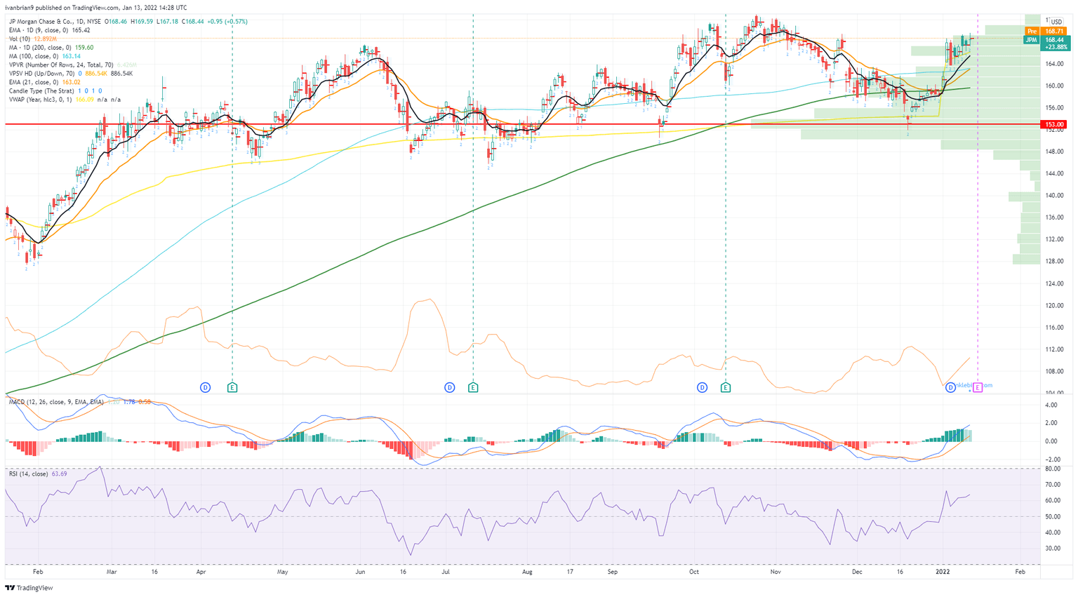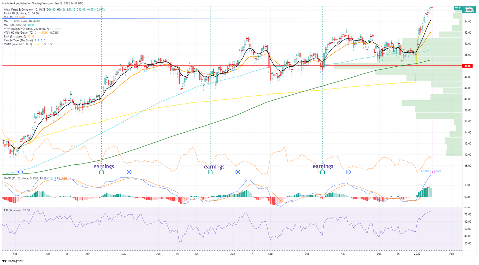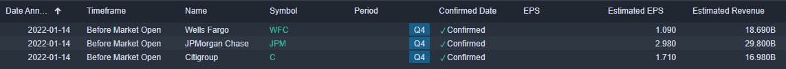 Bank stocks kick off earnings season as they normally do with a decent slate lined up for Friday, January 14. Citigroup (C), Wells Fargo (WFC) and JPMorgan (JPM) will get things rolling nicely as they all report before Friday's market open. The environment so far in 2022 is more cautious with riskier assets lagging and the growth versus value rotation being talked up in favour of value.