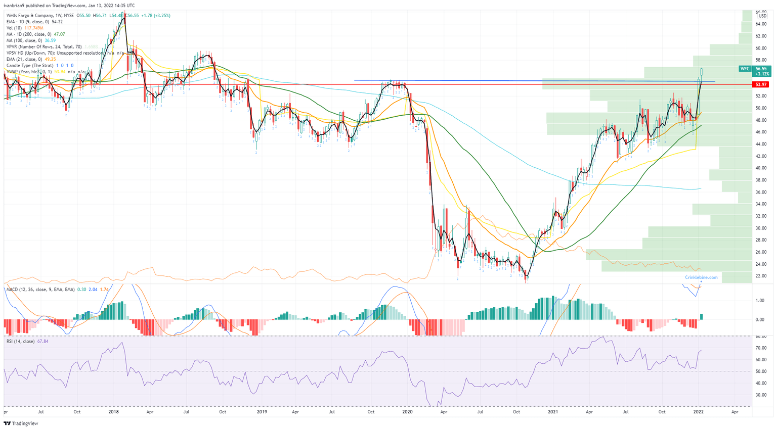 Wells Fargo (WFC) is expected to post earnings per share of $1.09 on revenue of $18.69 billion. These numbers if matched would show a near 10% gain in EPS growth but again revenue staying more or less flat. However, revenue growth versus Q4 last year would be solid circa 4%. Wells is the more retail-orientated with less exposure than Citi or JPMorgan to investment banking but should still benefit from an accommodative macro background. Notably, Wells (WFC) stock has also spiked this year and is up 17% year to date. The stock has recently broken above key resistance at $54.43 and needs to hold here to remain bullish in our view.