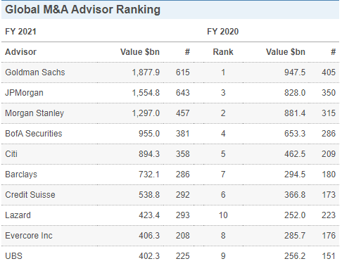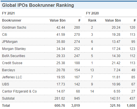 Again the big beasts in the banking world have more than doubled their IPO deal activity in 2021 versus 2020.