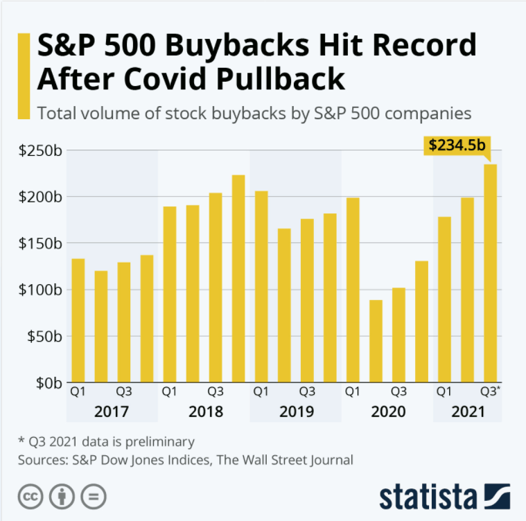 Stock buybacks are already at record levels. Investment banks mandated to carry out buybacks earn juicy fees for the buyback as well as notable market share. Stock buybacks reached a record level in 2021 and look set to continue that trend for 2022.