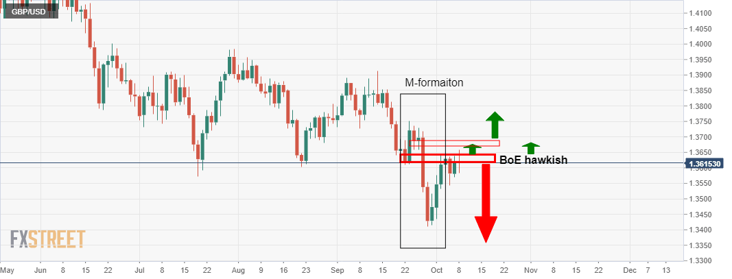 As per the chart above, GBP/USD has corrected and stalled at old support which gives rise to prospects of a downside continuation for the days ahead. However, the BoE theme could give the pound a boost to start the week into the M-formations neckline and derail the bearish outlook, at least, for the immediate term.