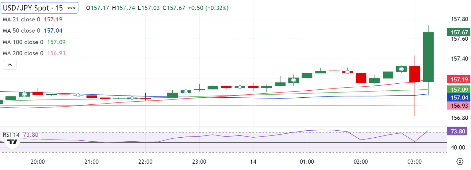 USD/JPY jumped sharply in a knee-jerk reaction to the BoJ’s policy announcements. The pair is currently trading at 157.75, up 0.45% on the day.