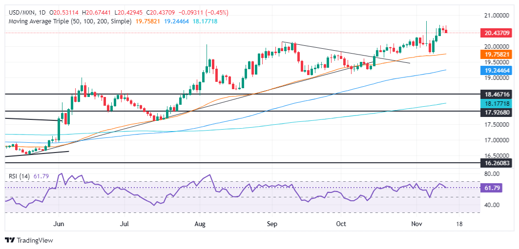 The USD/MXN spiked toward 20.55, before printing new daily lows below 20.45. Despite this, the exotic pair bias is tilted to the upside, unless sellers push the exchange rate below 20.00, ahead of testing the 50-day Simple Moving Average (SMA) at 19.74. On the upside, buyers had a clear path to test year-to-date (YTD) highs at 20.80, if they reclaim 20.50.