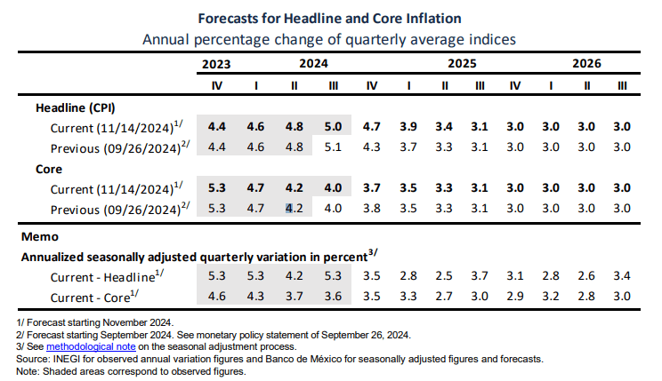 Banxico updated their forecasts for 2024, 2025 and 2025. The board projects that headline inflation will converge to the bank’s 3% target in Q4 2025.