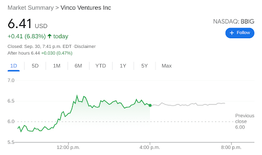 NASDAQ:BBIG turned the tide on Thursday as the blockchain-based company snapped its recent cold streak. Shares of BBIG jumped higher by 6.83% and closed the trading session at $6.41. The move higher erased most of the losses from the past couple of days, and came amidst yet another volatile day for the broader markets. The Dow Jones was slammed again on Thursday as the blue-chip index fell by 546 basis points. The S&P 500 and NASDAQ also closed lower as September comes to a close. The month was the worst for the S&P 500 since March of 2020 when the COVID-19 pandemic temporarily sent the global markets into a recession.