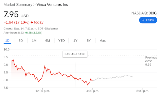 - VInco Ventures falls alongside other meme stocks during another volatile session.