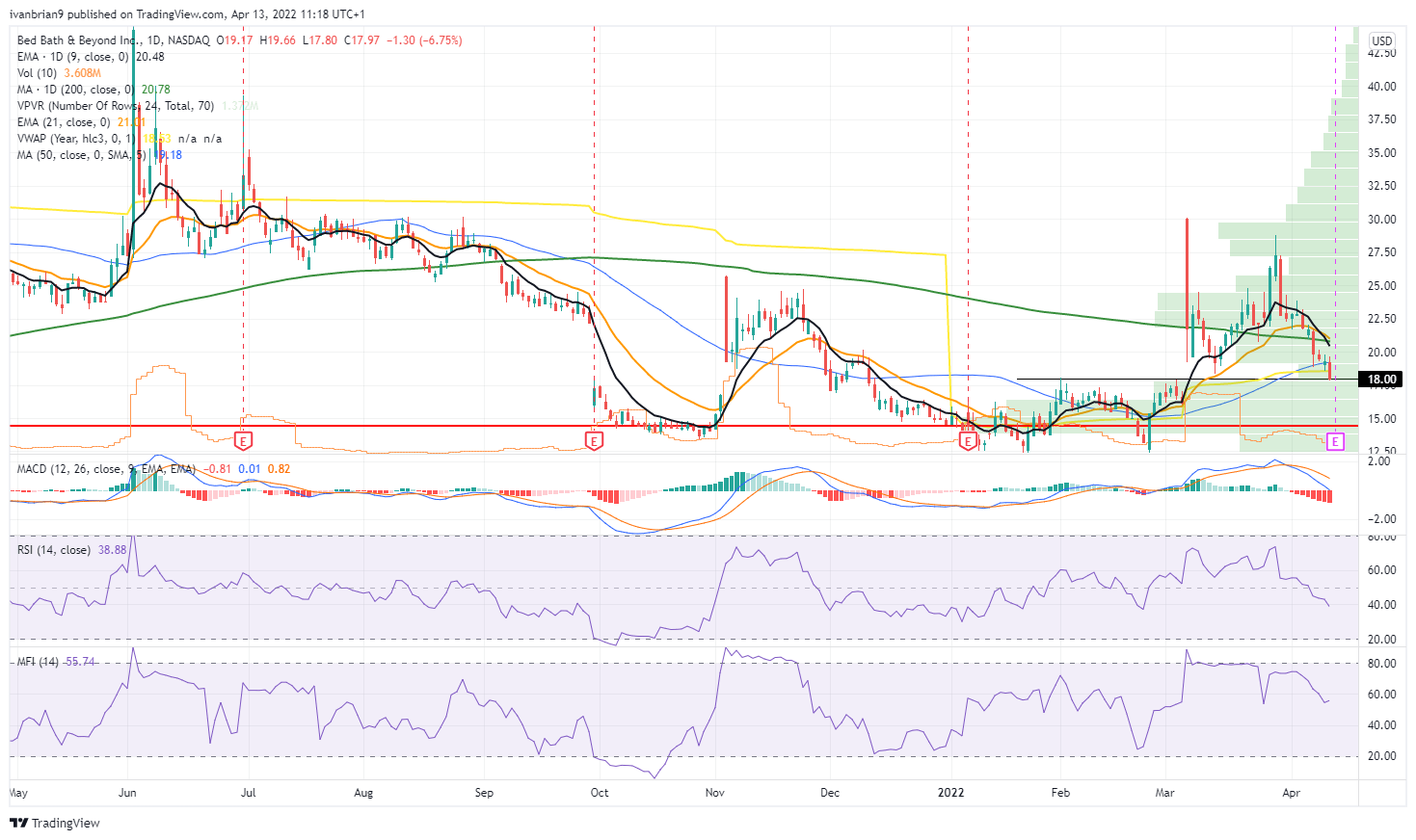 Bed Bath and Beyond Inc (BBBY) reports its Q4 earnings today before the open. Investors and retail traders will be tuning in to see what GameStop supremo Ryan Cohen can do with the company he recently invested in. BBBY stock spiked over 30% in early March when news broke that Ryan Cohen had taken a 9.8% stake in BBBY stock. This saw a frenzy of activity with BBBY stock opening March 7 at $30 before falling off to close at $21.71. That was a gain of 34% though even with the fall from earlier intraday highs. Since then BBBY has given back nearly all those gains and closed Tuesday at $17.97.