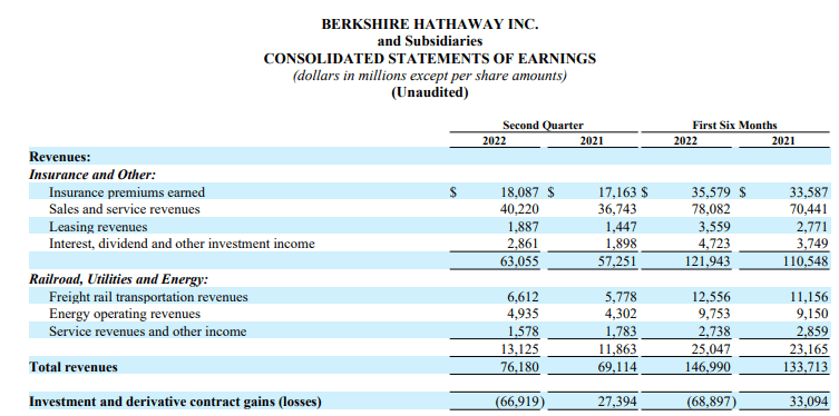 If we look at Berkshire's most recent company filings, we can see that insurance and other revenues are the largest contributors to overall revenue. Berkshire splits the overall revenue streams into three entities: Insurance; Railroad, utilities and energy; and finally investment gains/losses.