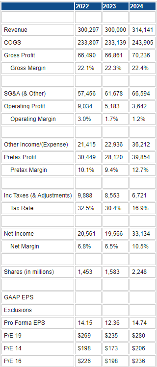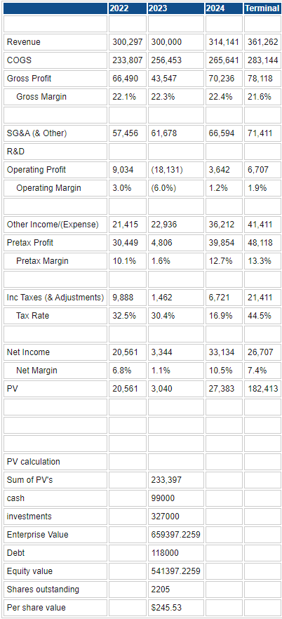 Starting with consensus estimates, we adjust 2023 to take into account likely losses from equity investments. We conservatively take down revenues by 10% to reflect an overall decline of at least that in the equity investment book. Our deep dive currently has Apple declining to $100, which would be a much larger drop. That gives us a discounted cash flow price more or less in line with the current market price: $245.53, slightly below the $277 current price for Berkshire Hathaway B shares.