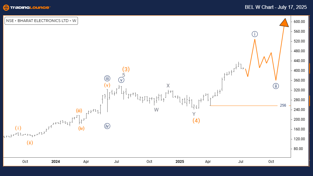 The weekly Elliott Wave analysis for BHARAT ELECTRONICS outlines a bullish market phase marked by impulsive price movement. The market is forming a Navy Blue Wave 1 within a broader Gray Wave 1, suggesting the stock has entered an early stage of a new upward trend cycle.
