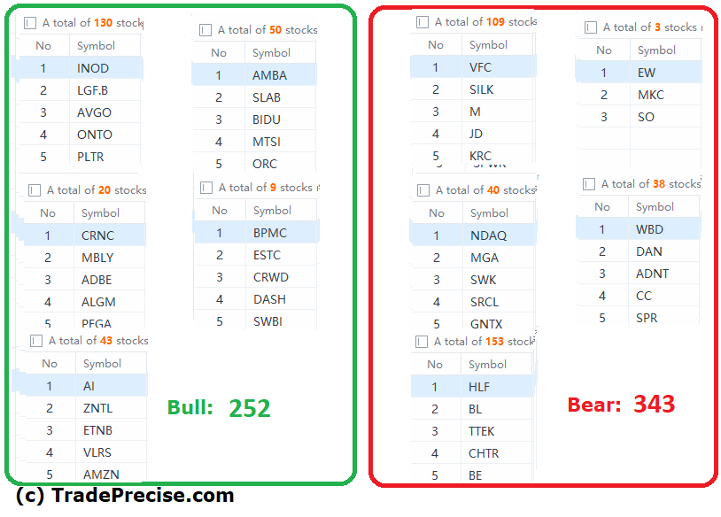 The bullish setup vs. the bearish setup is 252 to 343 from the screenshot of my stock screener below pointing to a negative market environment.