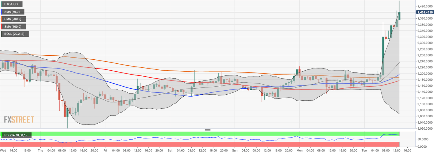 Bitcoin was locked in a tight range for too long; however, the bulls woke up and pushed the price of the first digital asset above the local resistance of $9,200 and towards 50-day SMA at $9,350. At the time of writing, BTC/USD is changing hands at $9,400, having gained over 2.6% since the start of the day.