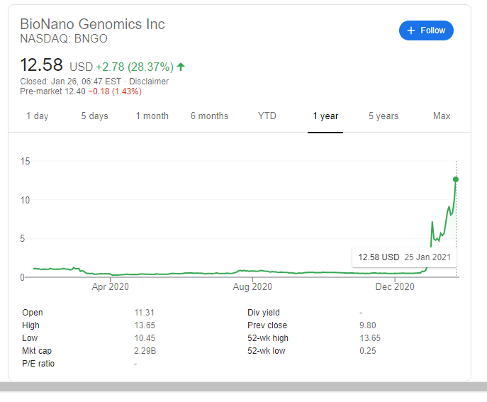 - NASDAQ: BNGO has soared by 14% on Tuesday to $12.16.