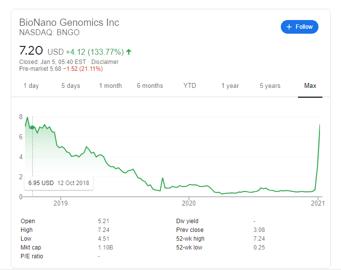 NASDAQ: BNGO has closed Monday's trading at $7.20, a leap of 133.77%, after hitting a high of $8.25. These levels were last seen when Bionano Genomics IPOed back in 2018. Can share continue even higher?