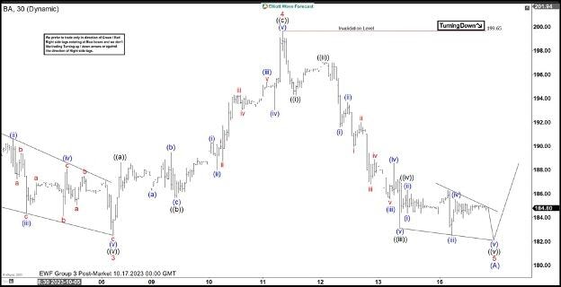 Short Term Elliott Wave in Boeing (BA) suggests the decline from 8.1.2023 high is unfolding as a 5 waves impulse. Down from 8.1.2023 high, wave 1 ended at 212.88 and wave 2 rally ended at 231.17. The stock then extends lower in wave 3 towards 182.55, and wave 4 rally ended at 199.65. Internal subdivision of wave 4 unfolded as a zigzag. Up from wave 3, wave ((a)) ended at 188.64 and pullback in wave ((b)) ended at 185.68. Final leg wave ((c)) higher ended at 199.65 which completed wave 4.