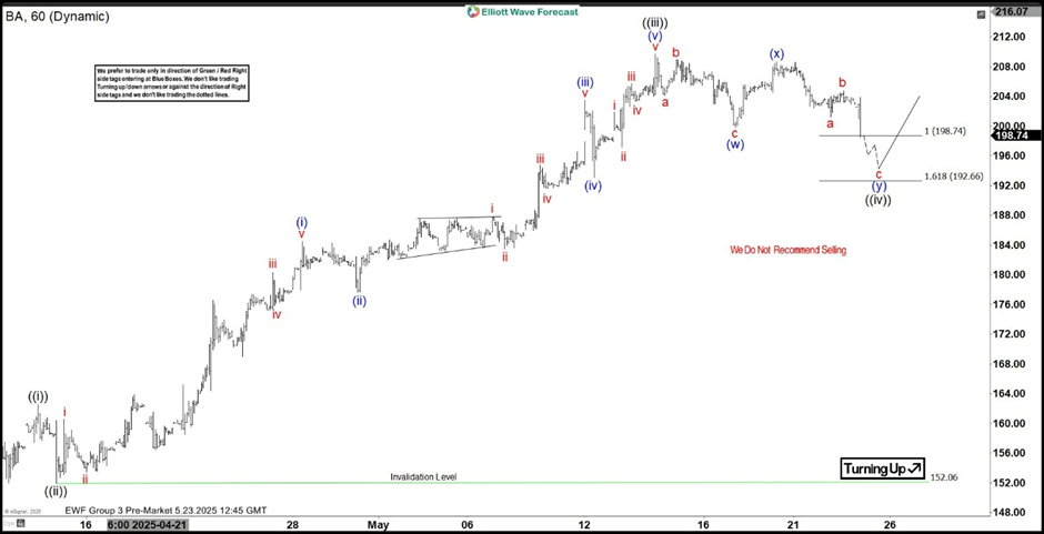 In the 1-hour Elliott Wave count from May 23, 2025, we saw that $BA completed a 5-wave impulsive cycle at ((iii)). As expected, this initial wave prompted a pullback. We anticipated this pullback to unfold in 7 swings, likely finding buyers in the equal legs area between $198.74 and $192.66.