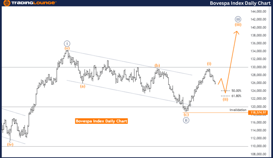 The Bovespa Index Elliott Wave Analysis on the daily chart indicates the market is currently in a counter-trend phase, characterized as corrective. The focus is on Orange Wave 2, positioned within Navy Blue Wave 3. This suggests the market is undergoing the second corrective wave within a larger third wave, often part of a larger trend.