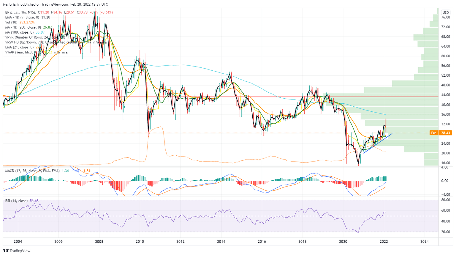 This is likely to be dominated by oil and gas prices, both of which are underpinned by the conflict. Currently, oil prices are nearly double that $50-$60 expectation. However, this is a significant impact on BP sentiment and could see a retracement to $26 and a consolidation phase. Indeed volume-based support is high from $26 to $24.