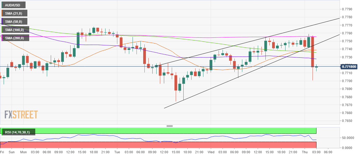 The price has cut through all the major hourly moving averages (HMAs), exposing the critical 0.7700 support, below which Tuesday’s low of 0.7676 could be tested.