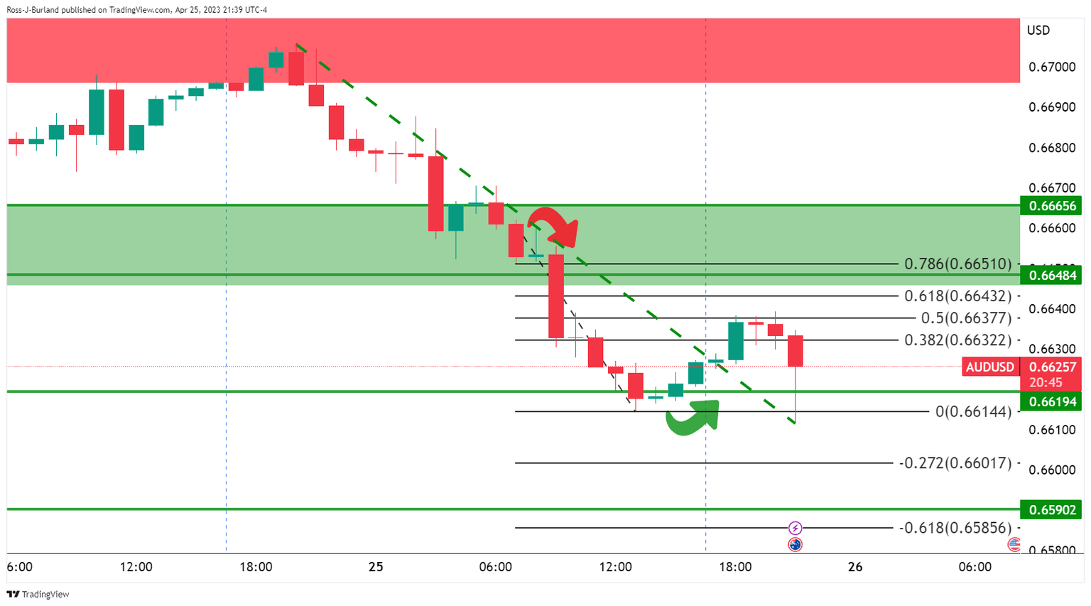 The price was rejected at the 50% mean reversion mark ahead of the data and was forced lower on the outcome from the 38.2% Fibonacci area to a fresh low in the bear cycle at 0.6611.