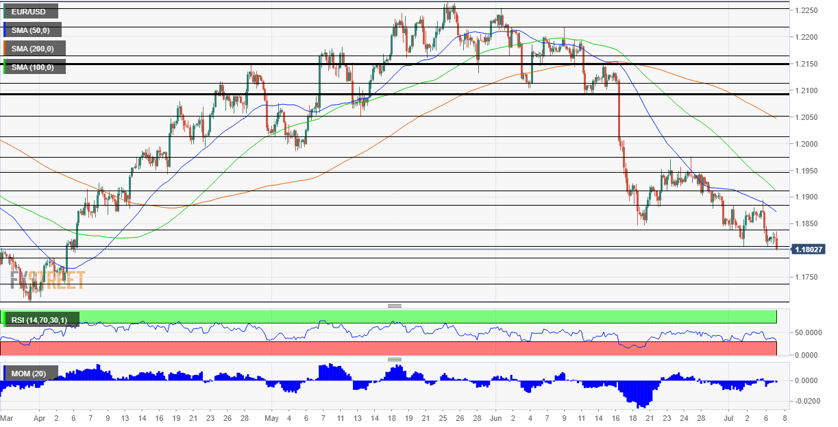 EUR/USD has tumbled below 1.18, hitting the lowest levels since early April – a three-month low. The main driver is dollar strength, which comes ahead of the Federal Reserve's release of its meeting minutes from its hawkish June decision.