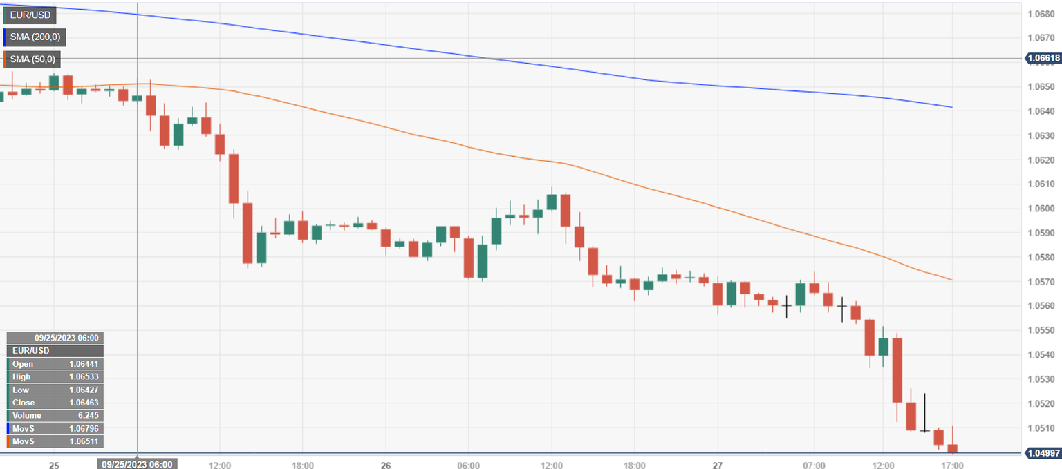 The EUR/USD is tanking below 1.0500 after hitting a daily high of 1.0574 as US Treasury bond yields continued to climb while market sentiment deteriorated, as Wall Street registers losses between 0.45% and 0.60%.
