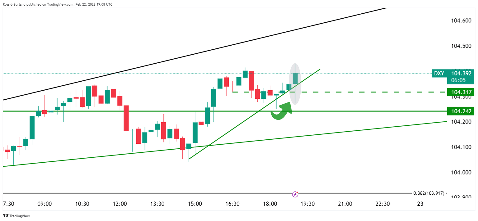 DXY is moving up to fresh highs on the prospects of a 50bp rate hike next time around. However, the price action is volatile and bears are fading bullish attempts within the first 15 min candle: