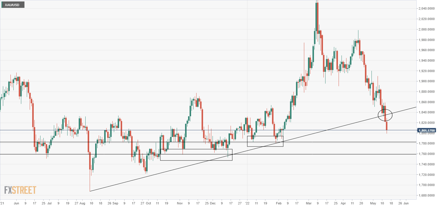 - Bears are eyeing a test of annual lows in the $1780 area following a key trendline break earlier this week.