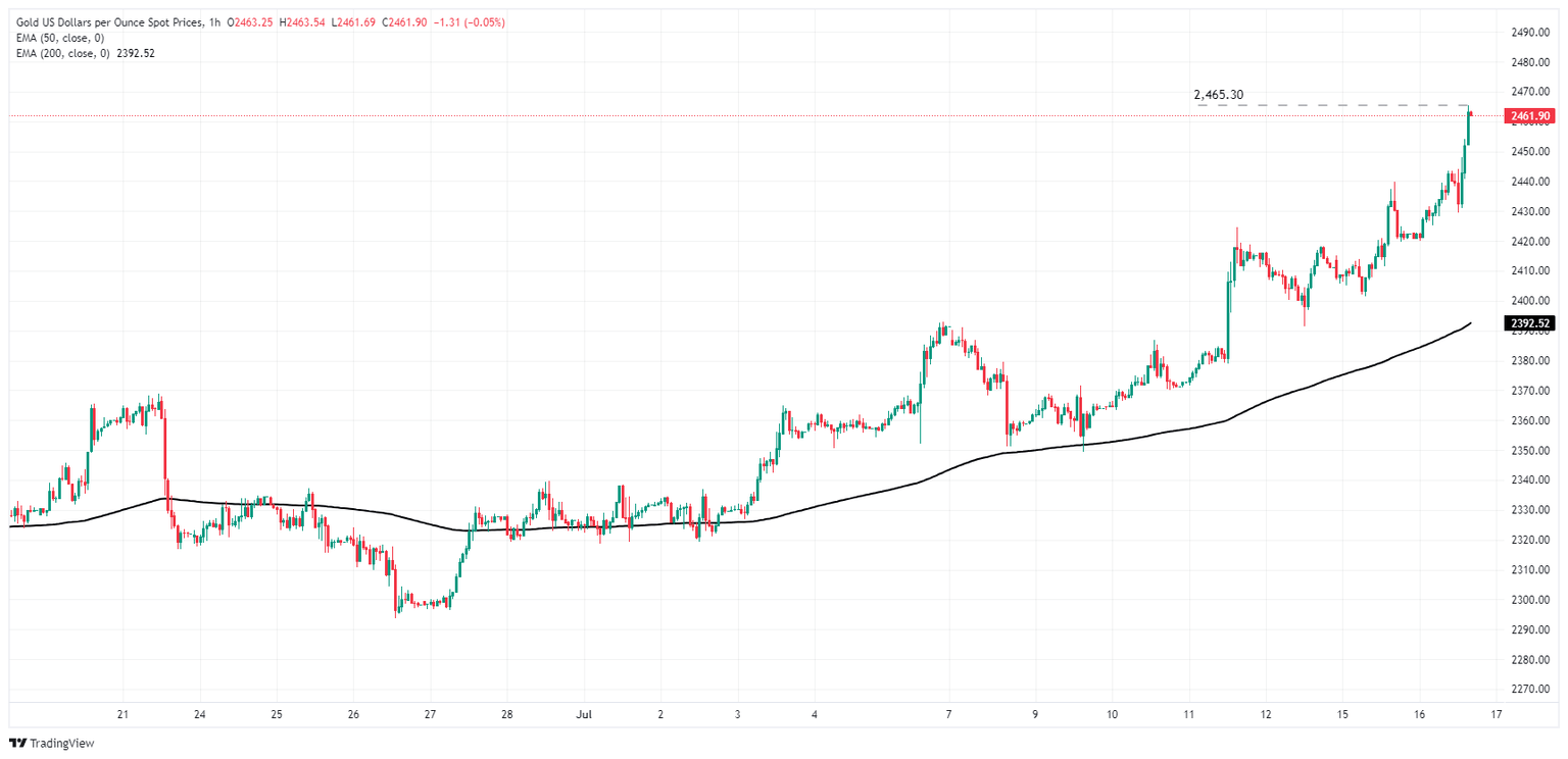 With US data softening and growing concerns about an economic downturn weighing on the US domestic economy, rate cut bets have been pinned to the ceiling and investors are piling into Gold, pushing XAU/USD to a record high of $2,465.30 during Tuesday's US market session.