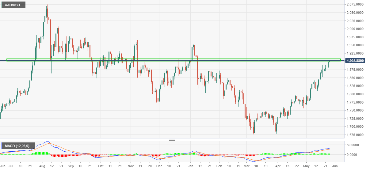 Gold (XAU/USD) takes the bids around $1,904, up 0.20% intraday while refreshing the multi-day high during early Wednesday. In doing so, gold buyers justify market optimism while crossing the key hurdle to the yearly top surrounding $1,960. However, the daily chart signals $1,907 as an intermediate halt during the gold price run-up.