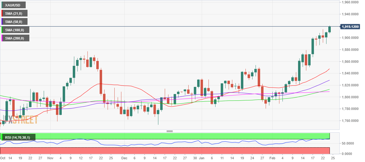 The June 2021 peak surrounding $1,917 is taken out, as bulls clinch fresh yearly highs above $1,920. The next powerful resistance is seen at $1,934.