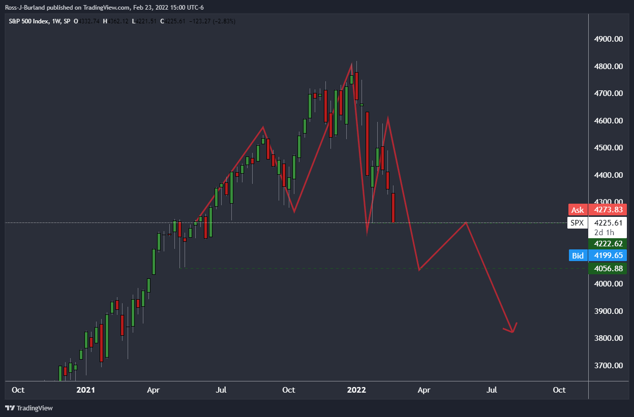 In the above analysis, the index has been shown to form a topping head & shoulders on the weekly chart with the price just having broken the prior weekly lows of Jan 24 2022. This is a significant development for financial markets during a pivotal milestone in the Ukraine crisis that just turned up a notch.