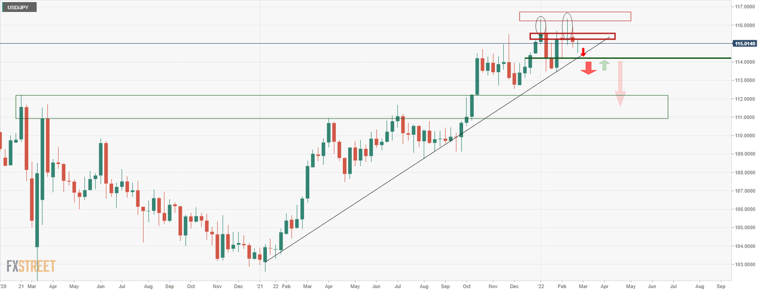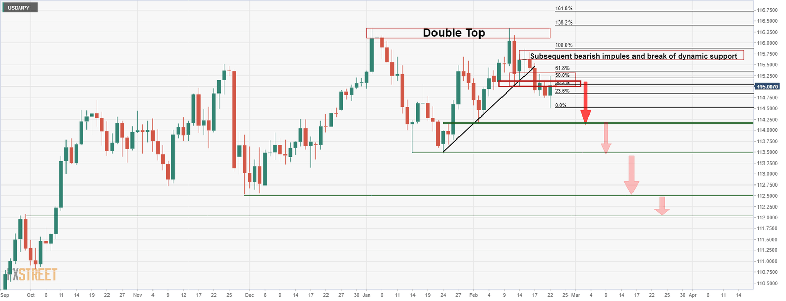 Considering the dire outlook for equities, the yen would be expected to pick up the flows and the weekly and daily charts are aligned bearishly as follows: