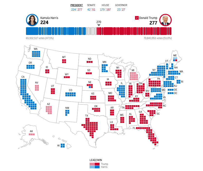 The Republican nominee has secured 277 electoral votes. Kamala Harris, meanwhile, obtained 224 electoral votes.