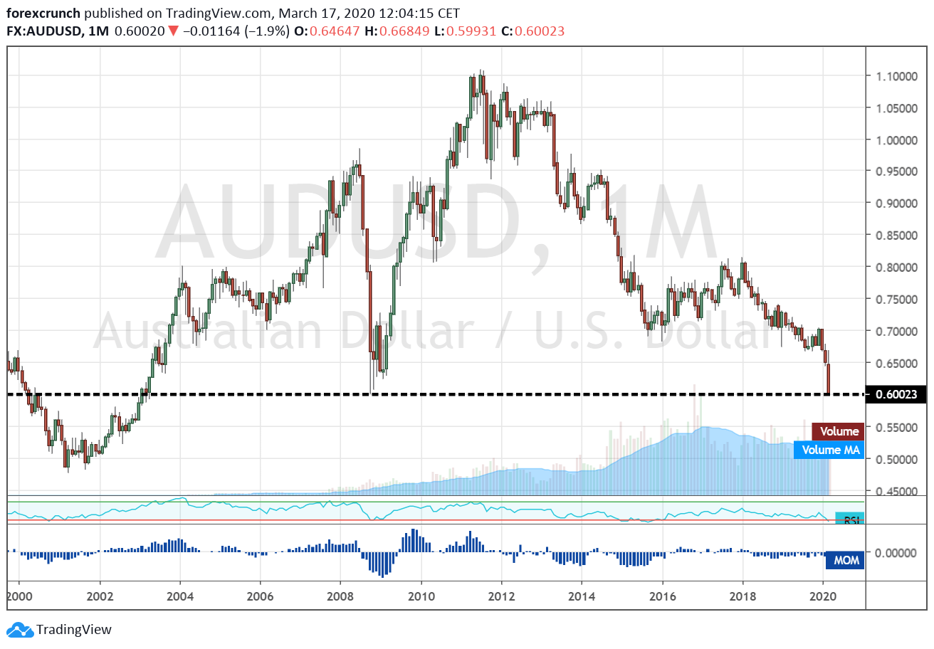 Here is the monthly AUD/USD chart, showing the depths of the fall: