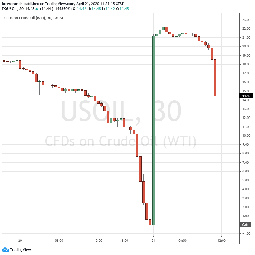 Update: Oil has continued its free-fall and is trading below $12 in a fast move before bouncing to closer to $15. Volatility is high. The daily range at the time of writing has been $11.55 to $22.55.